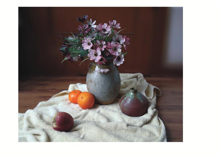 三、模拟写生内容:一束鲜花,两个陶罐,一个苹果,两个橘子,一块浅色衬布。见下图