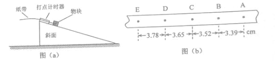 某学生用图(a)琐事的实验装置测量物块与斜面的懂摩擦因数。已知打点计时器所用电源的频率为50Hz,物块下滑过程中所得到的只带的一部分如图(b)所示,图中标出了5个连续点之间的距离。