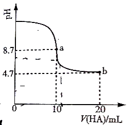 13、室温下向10mL0.1 mol·L-1NaOH溶液中加入0.1 mol·L-1的一元酸HA溶液pH的变化曲线如图所示。下列说法正确的是