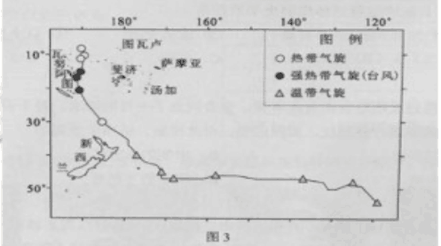 图3:2015年3月9日-22日气旋“帕姆”的移动路径。读图,回答第9、10题